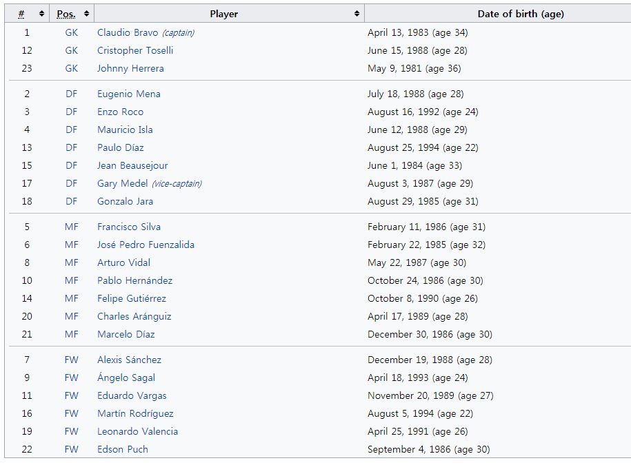 칠레는 풀전력이다. 에이스 FW 산체스(아스널) 비달(뮌헨) 등은 물론 수비진에 A매치 100경기 이상을 뒨 DF 메델(인테르) 하라(유니버스다드) GK 브라보(맨시티)가 모두 뽑혔다. 칠레의 최근 국제대회 성적은 인상적이다. 코파아메리카 2연패로 남미 강호로 우뚝 섰다. 6월 들어 치른 3차례 평가전은 1승1무1패. 부르키나파소를 3-0으로 꺾었지만 러시아와 1-1로 비겼고 루마니아에 2-3으로 졌다.