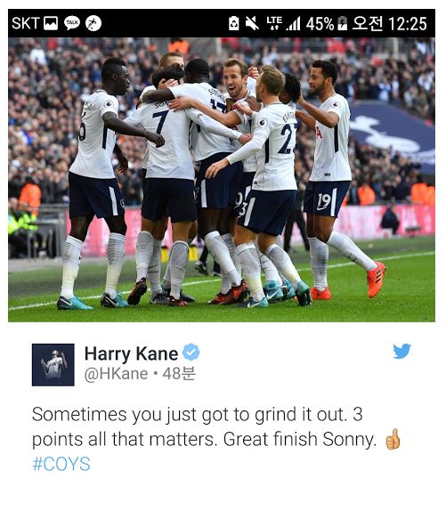 네티즌들의 반응이 다양하다. 박지성의 골보다 많은 것은 분명하지만 여전히 경기력에 대한 의문도 제기되고 있다. 이런 가운데 토트넘 팀 동료 해리 케인은 경기가 끝난 뒤 SNS에 아래와 같은 문구를 올렸다.