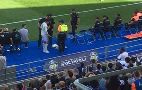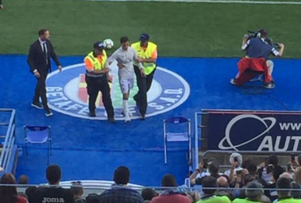 [사진] 경기장에 난입한 호날두 코스프레 팬이 경찰에 연행되고 있다.(온라인커뮤니티)
