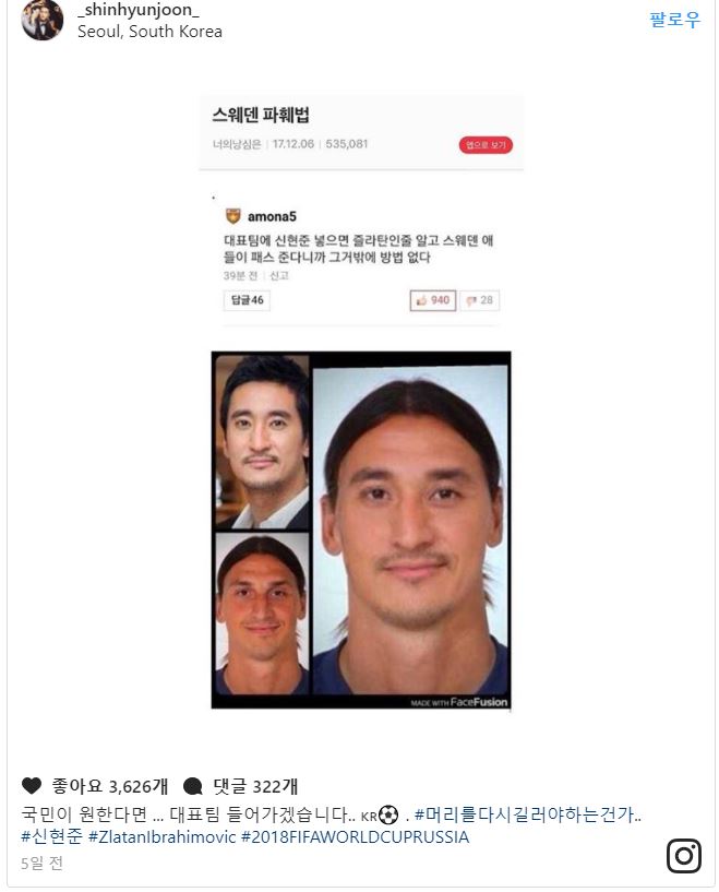 글쓴이는 '스웨덴 파훼법'으로 "대표팀에 신현준 넣으면 즐라탄인줄 알고 스웨덴 애들이 패스 준다니까 그거밖에 방법 없다"며 신현준 씨의 사진과 즐라탄의 사진을 함께 올렸다.
