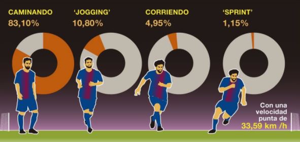 이를 뛴 거리로 환산하면 메시는 이날 '걷기'로 6.67km, '조깅'으로 867m, '러닝'으로 397m, '스프린트'로 92.3m를 기록했다. 레알 마드리드를 상대로 전후반 90분을 뛰며 전력 질주를 100m도 하지 않았다는 말이다.