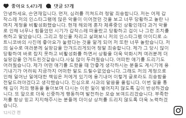 손연재는 "그 당시 악플에 많이 당황해 바로잡지 못하고 비활성화를 하면서 상황을 더욱 악화시켜 더 실망감을 안겨드린 것 같다"며 "저의 계정으로 인해 일어난 일에 대한 책임은 저에게 있기에 용기내어 이렇게 글로라도 죄송하다고 전하고 싶다"고 말했다.