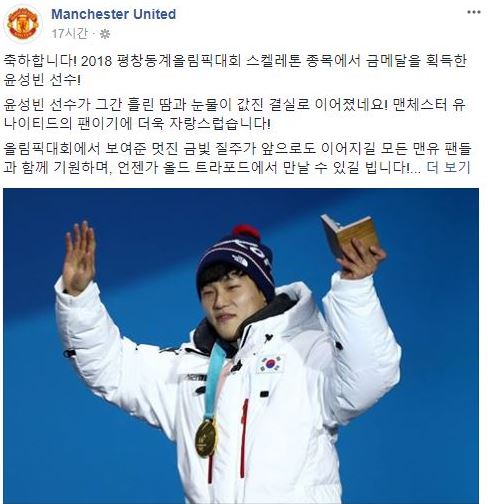지난 19일(한국 시간) 맨유는 공식 페이스북 등 SNS 채널을 통해 2018 평창 동계올림픽 남자 스켈레톤 종목에서 금메달을 획득한 윤성빈을 위한 축하 게시물을 게재했다.