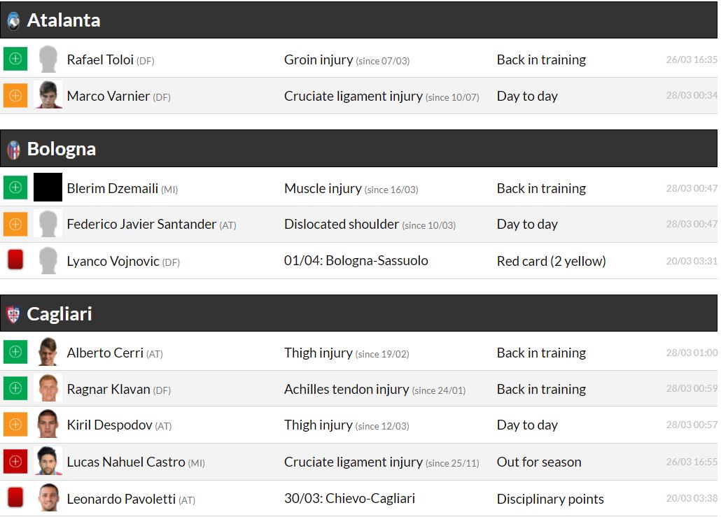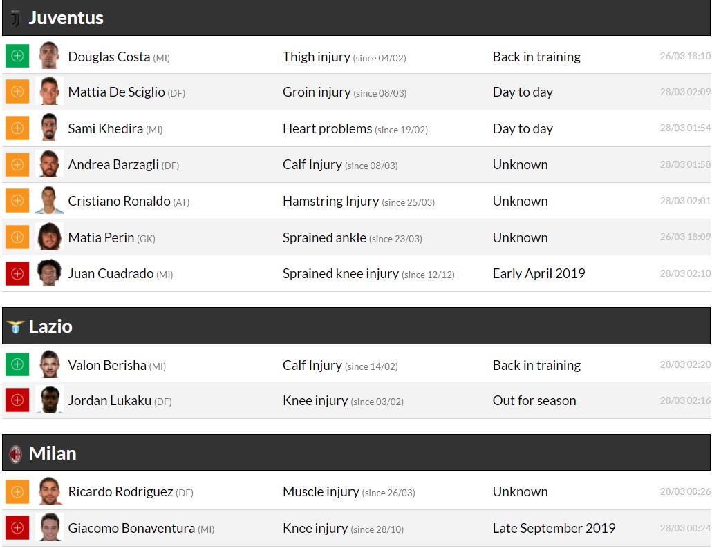 세리에A 29라운드 각 팀 부상자 및 결장 예정 선수