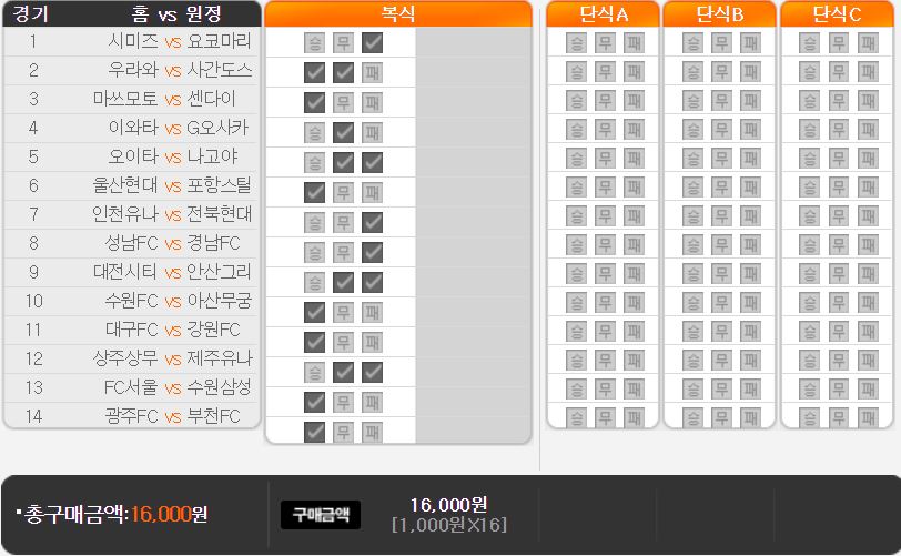 중복 체크 여부: 승/무 쪽으로 방향을 잡고, 서울 승리를 우선 순위로 고려하는 것이 좋아 보인다. 중복 체크 우선 순위는 2~3순위 정도로 고려하는 것이 좋다.